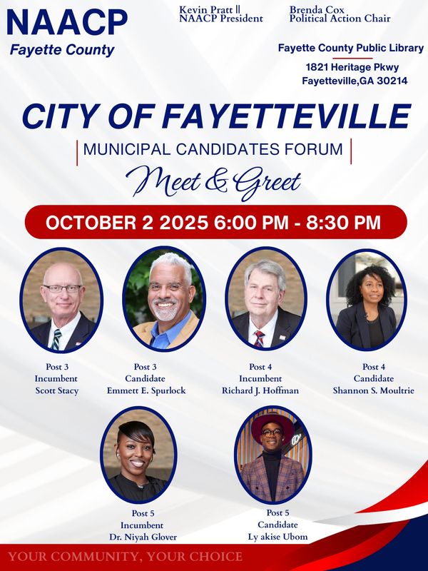 Please plan on attending the NAACP, Non - Partisan Fayetteville Municipal Candidates Forum at the Fayette County Public Library, 1821 Heritage Parkway, Ga. 30214, 6:00 PM to 8:30 PM. Please spread the information about the "Forum". and bring a friend or group. All of the candidates and Incumbents have RSVP.