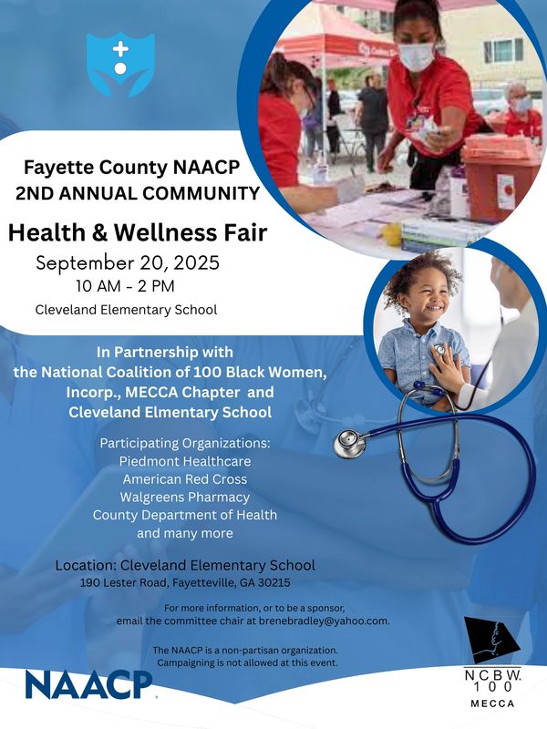 The Fayette County Georgia NAACP will host its 2nd Annual Community Health & Wellness Fair. The Fair is a partnership of the NAACP, The 100 Black Women, MECCA Chapter, and Cleveland Elementary School of Fayette County School District. The fair will be held at Cleveland Elementary School from 10:00 AM to 2: 00 PM, on Saturday, September 20, 2025.